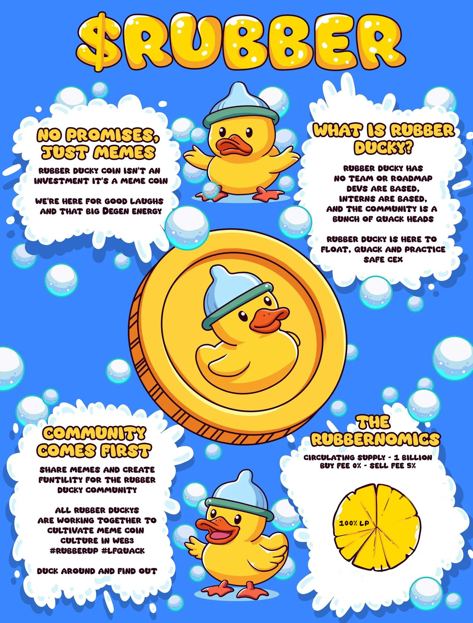 Crypto products such as meme coins and [non-fungible tokens or NFTs] are unregulated and can be highly risky. There may be no regulatory recourse for any loss from such transactions. This is an unregulated product and does not constitute a “currency,” “securities,” “custodian” or “depositories”. Information on past performance is not an indication or an endorsement of future performance. Investments in unregulated digital assets are risky and should not be done without proper research. DO NOT Invest more than you’re willing to lose. The Rubber Ducky Community holds the explicit right to utilize funds accumulated as directed by members of the community. Rubber Ducky Community maintains the right to perform actions related to the token contract at the discretion of members of the Rubber Ducky Community. Meme coin and NFT Purchasers hold harmless Rubber Ducky Community for any actions taken on behalf of the holder or the Rubber Ducky Community and its members. Must be 18 years or older to participate in this digital asset.